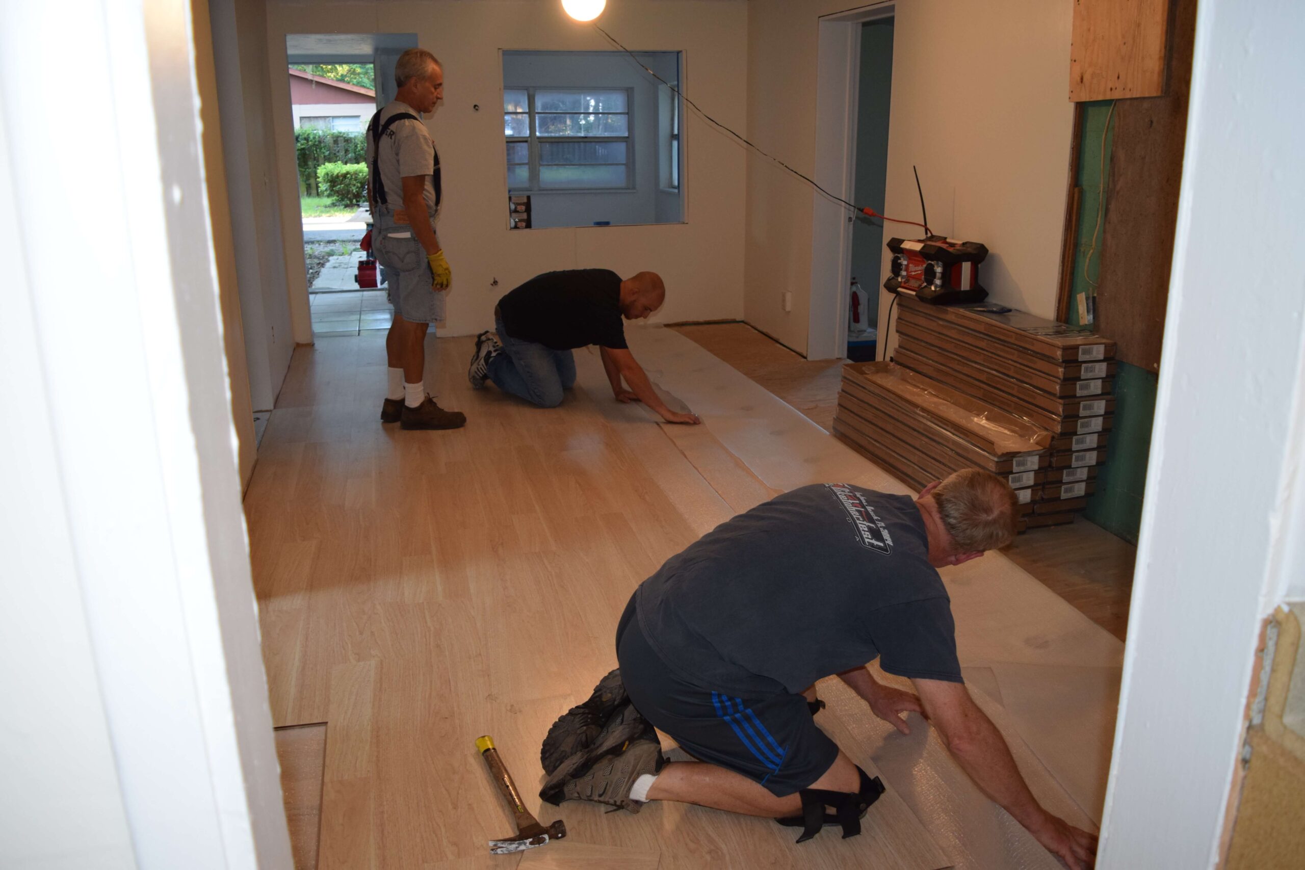 volunteers laying flooring